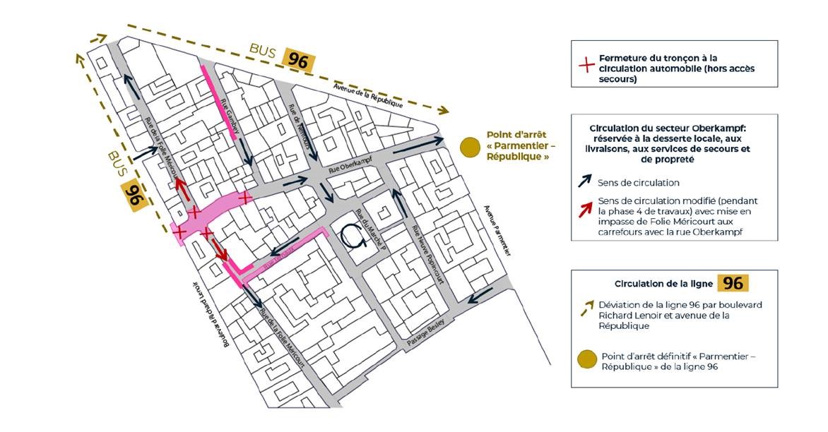 Le point d’arrêt « Parmentier – République » de la ligne de bus 96 a été déplacé et mutualisé avec le point d’arrêt « Parmentier – République » des lignes 20, N12 et N23. Le bus 96 est dévié par le boulevard Richard Lenoir et l’avenue de la République pendant les quatre premières phases du chantier avant de retrouver son passage sur la rue Oberkampf à partir de début 2024.